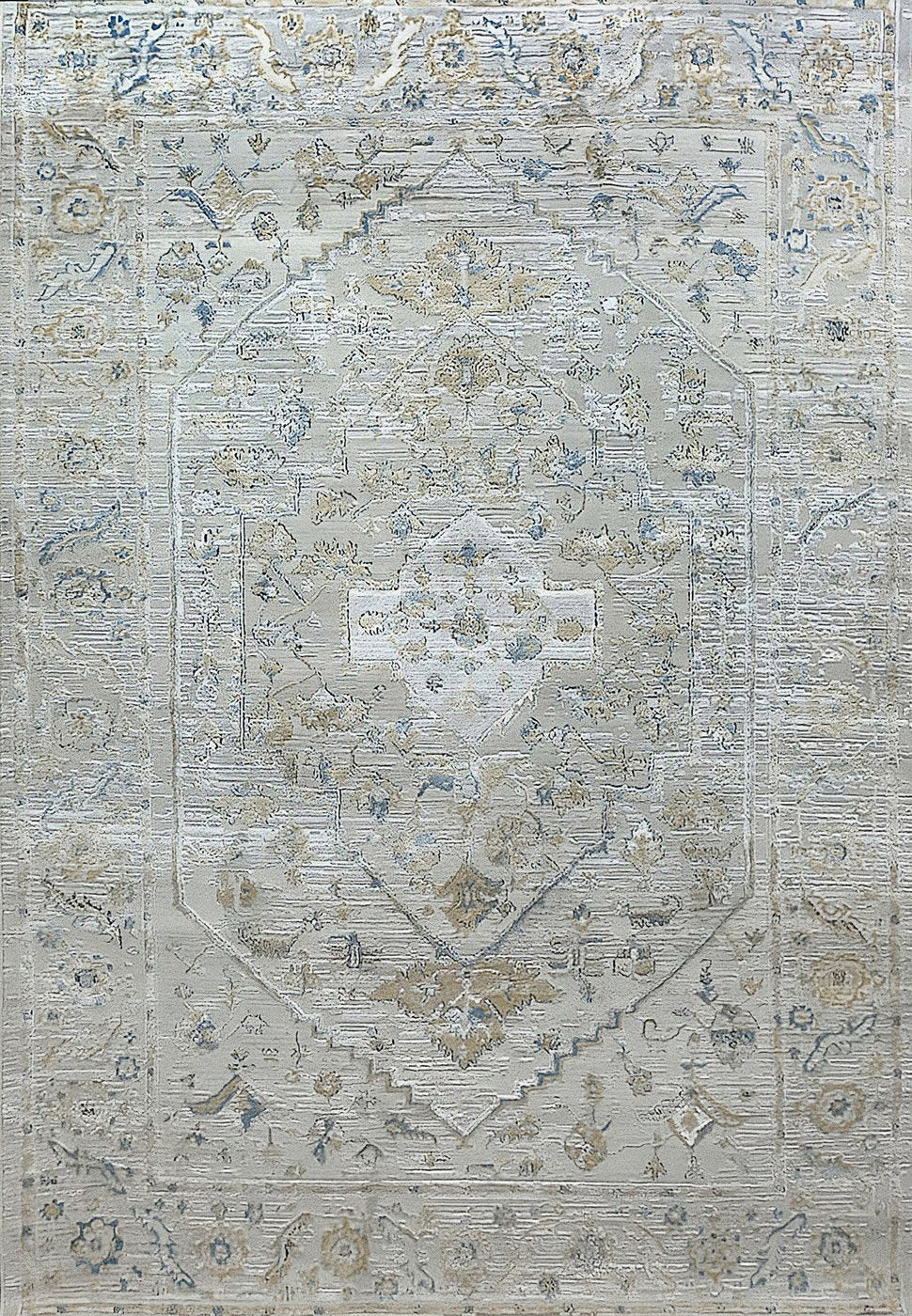 Reha showcases captivating pops of blues and golds flowing throughout its design, creating a visually dynamic and engaging aesthetic. These accents add vibrancy to the beautiful canvas of ivory and grey backgrounds, making Reha a lively and eye-catching statement piece. Reha combines comfortable textures with modern interpretations of traditional and abstract designs. This fusion not only adds sophistication to any space but also ensures a comfortable and inviting atmosphere, making it a versatile addition to diverse interior styles. power loomed in Turkey with a composition of polypropylene and polyester, Reha ensures durability alongside its aesthetic appeal. This combination of materials and craftsmanship makes Reha a practical and stylish choice for enhancing the ambiance of any room.